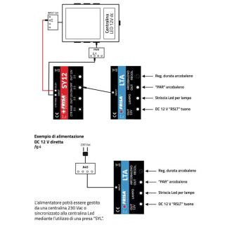 “LTA” può supportare lampo ed arcobaleno collegato direttamente nelle prese DC 2.5 delle centraline led sia in dissolvenza che ad accensione on/off. Per la gestione del tuono è necessaria maggiore corrente; sarà quindi necessario collegare il dispositivo su alimentazione diretta 12 volt mediante alimentatore esterno o utilizzare la presa sincronizzata SY12 per il collegamento alle centraline.